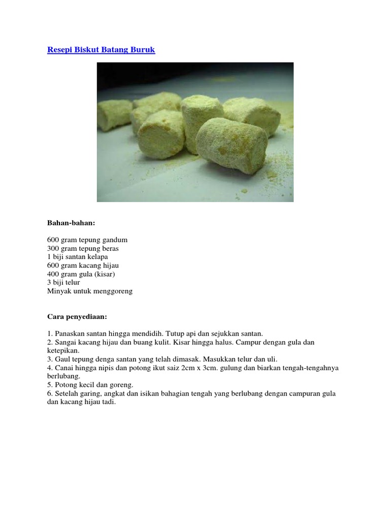 Mudah disediakan dan hanya menggunakan beberapa bahan asas sahaja. Original resepi mengguna biji kacang hijau untuk dijadikan habuk kuih batang buruk. Ia adalah sejenis kuih yang dibuat daripada tepung gandum dicampur dengan tepung beras dan tepung kelapa yang diuli buat menjadi doh dan dibentuk membentuk silinder bulat berongga. Asalnya resepi kuih raya ini menggunakan sukatan atau timbangan tin quaker. Bukan sahaja bulan syawal yang disambut meriah, ada sesetengah orang juga menyambut ketibaan ramadhan dengan sangat meriah. Selepas adunan doh digelek dan kelongsong batang buruk siap digulung, ianya perlulah dibiarkan semalaman untuk kurangkan kelembapan air dalam adunan. Salam.ni first entry saya dlm blog ni.bukan apa.saya baru nak start jual kuih batang buruk ni secara online =) memandangkan modal xbnyk.saya try la nak jual dlm blog ni.mna la tau kot2 ada sape2 yg teringin nak rasa mcm mna rasa kuih batang. Kuih batang buruk adalah sejenis kuih tradisi yang terkenal di malaysia. Goreng tepung kacang tanpa minyak hingga kekuningan. Semalam saya ada post resepi biskut batang buruk kan? Tapi kalau nak cepat, kita boleh ganti tepung untuk buat batang buruk tu dengan kulit popia. Kuih batang buruk icookasia resepi ramadan hari raya kuih raya. 600 gram tepung gandum 300 gram tepung beras 1 biji santan kelapa 600 gram kacang hijau 400 gram gula (kisar) 3 biji telur minyak untuk menggoreng.