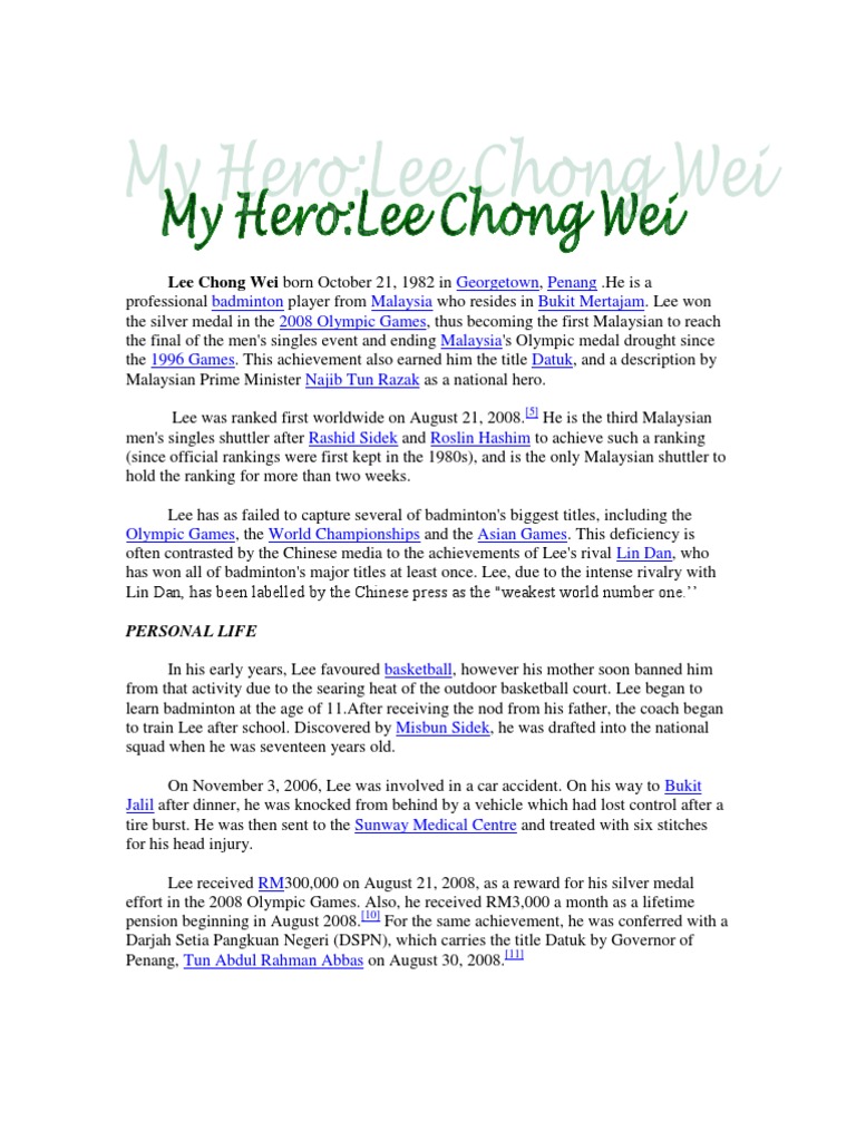 Download & view datuk lee chong wei (biodata) as pdf for free. Akan dikemaskinikan nama isteri : Datuk lee chong wei mula bermain badminton semasa beliau berumur 11 tahun. As a singles player, lee was ranked first worldwide for 349 weeks. 1 (perseorangan lelaki) salah seorang atlit yg telah berjaya membawa nama malaysia ke. Born october 21, 1982 in georgetown, penang2) is a professional badminton player from malaysia who resides in bukit. Unless you want to call him by his granted title, which is dato' lee chong wei. .datuk lee chong wei (born 21 october 1982 in bagan serai, perak2) is a professional badminton player from malaysia who resides in bukit mertajam.3 as a singles player, lee was ranked first worldwide for 199 consecutive weeks from 21 august 2008 to 14 june 2012.4 he is the third. Lee chong wei signing out. Pada saya, kita malaysian, raya cina ker, raya puasa ker, raya deepavali ker , raya gawai keamatan ker… Lee chong wei's full name is just like that, lee chong wei. 1 badminton men singles player. Pemain badminton perseorangan negara pendidikan dikurniakan gelaran datuk oleh perdana menteri malaysia datuk seri najib tun razak sebagai wira kebangsaan.