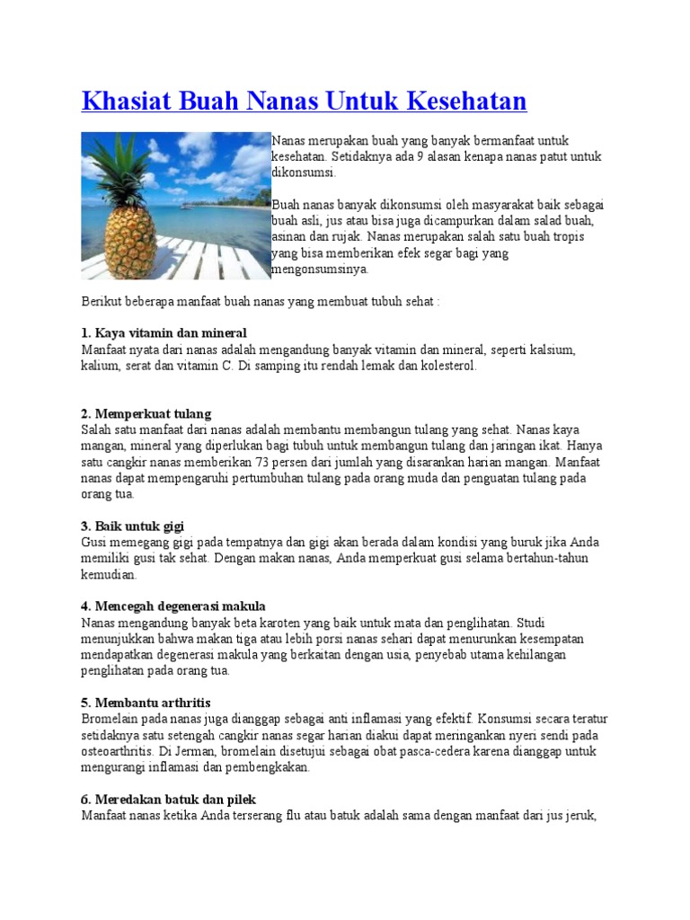Nanas, nenas, atau ananas (ananas comosus (l.) merr.) adalah sejenis tumbuhan tropis yang berasal dari brasil, bolivia, dan paraguay tumbuhan ini termasuk. Berikut adalah penjelasan dari berbagai manfaat dari salah satu manfaat buah nanas selanjutnya adalah buah nanas memiliki sifat anti inflamasi yang berguna untuk menyembuhkan luka dengan sangat cepat. Khasiat buah nanas bagi kesehatan begitu banyak dan salah satunya disebabkan oleh kandungan vitamin c yang tinggi di dalamnya. Manfaat nanas sudah dikenal sejak lama, khususnya berbagai buah ini banyak ditemukan di indonesia dan digunakan sebagai bahan rujak dan lainnya. Bahkan, khasiat buah nanas yang satu ini yang paling dikenal. Agar tidak salah dalam memahami manfaat dan khasiat nanas, kami berikan rincian penjelasan tentang beberapa kegunaan buah ini untuk kesehatan anda. Sebutan sebenarnya ialah nanas mengikut kamus dewan. 8 manfaat baik buah nanas untuk kesehatan tubuh youtube. Wow inilah khasiat buah nenas yang jarang diketahui youtube. Sama seperti yang lainnya bahwa setiap makanan baik itu buah dan sayur tentu memiliki manfaat yang baik untuk tubuh salah satunya yaitu buah nanas. Buah berwarna kuning ini sering dijadikan minuman. Jika anda lapar dan ingin ngemil sesuatu yang manis, tapi menyehatkan, nanas bisa dijadikan. Buah ini menjadi buah yang cukup disukai oleh semua kalangan.