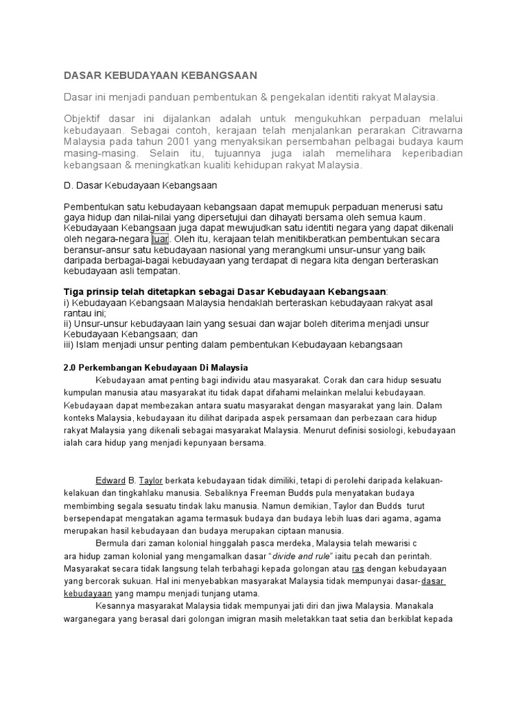 3.5 3 prinsip dasar kebudayaan kebangsaan (i) kebudayaan rakyat asal rantau melayu sebagai tunjang berteraskan kepada kebudayaan rakyat asal rantau ini yang merangkumi kawasan malaysia, indonesia, filipina, singapura, brunei, thailand dan kampuchea serta kepulauan selatan pasifik (polynesia, melanesia dan oceania) sehingga malagasi adalah. Prinsip dasar kebudayaan kebangsaan i. Pelaksanaan dasar kebudayaan kebangsaan merupakan medium yang sesuai untuk menonjolkan keunikan budaya yang terdapat dalam negara. Antaranya ialah rukun negara, dasar pendidikan kebangsaan, dasar ekonomi baharu, dasar pembangunan nasional dan sebagainya. Menjadi saluran untuk mengukuhkan perpaduan bangsa dan negara melalui kebuadayaan.