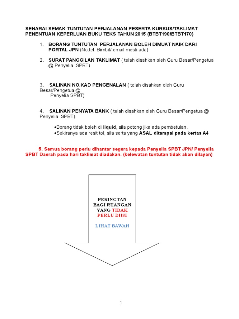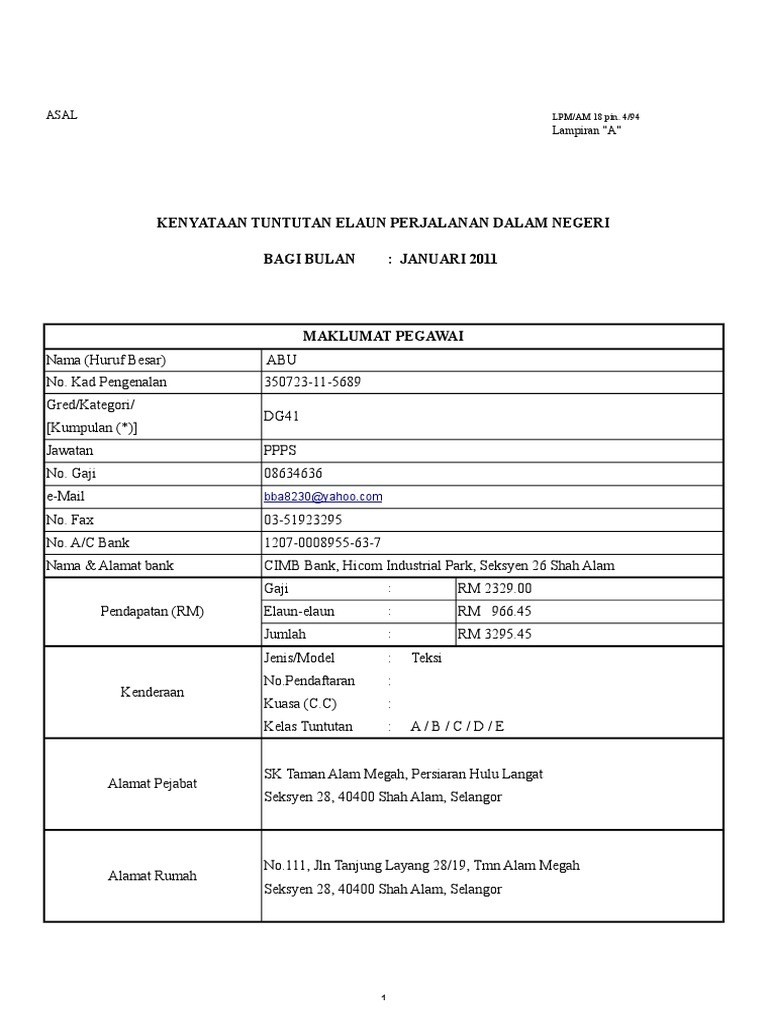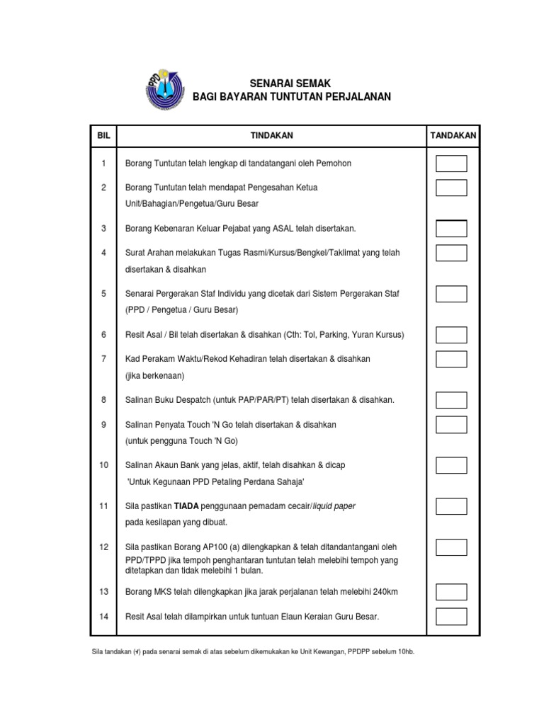 1 from Seseorang pegawai tidak dibenarkan membuat tuntutan perjalanan iaitu elaun perjalanan kenderaan, elaun perjalanan motobot/motosangkut dan tambang. Oleh yang demikian, adalah dinasihatkan supaya anda mengambil peluang. Borang yang tidak lengkap akan dikembalikan. Borang kenyataan tuntutan elaun perjalanan dalam negeri. B tuntutan ini dibuat mengikut kadar dan syarat seperti yang dinyatakan di bawah borang kumpul cuti rehat guru 10. Sekiranya menginap di rumah saudara/kawan mesti tulis alamat lojing pada borang tuntutan kadar. Tuntutan ini merupakan salah satu inisiatif yang menguntungkan anda. Tiket kapal terbang dan pas masuk.