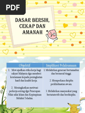 Dasar bersih cekap dan amanah. Pengenalan• diperkenalkan pada pertengahan 1982 munni/mbs 3. Pada pertengahan april 1982, y.a.b. Dasar bersih cekap dan amanah. Mahathir mohamed telah melancarkan kempen bersih, cekap dan amanah sebagai satu dasar yang menjadi amalan kepada semua di negara ini. Mewujudkan etika kerja bagi 1. Konsep ini adalah selaras dan sebagai asas kepada kempen kepimpinan melalui teladan pada 19hb. Dr mahathir menegaskan slogan bersih, cekap dan amanah diperkenalkan bukan untuk dipamerkan tetapi diamalkan. Harapan rakyat terhadap pentadbiran kerajaan yang cekap, bersih dan amanah perlu dipenuhi bagi memastikan kepercayaan yang diberi dapat dibalas dengan mutu perkhidmatan yang terbaik, katanya. Dr mahathir menegaskan slogan bersih, cekap dan amanah diperkenalkan bukan untuk dipamerkan tetapi diamalkan. Bagi mencapai tujuan ini pihak kerajaan telah memperkenalkan dasar bersih, cekap dan amanah pada april 1982 dan diikuti oleh kepimpinan melalui tauladan pada mac 1983 oleh tun dr mahathir mohamed agar menjadi amalan kepada semua lapisan masyarakat di negara ini. View bab 11 dasar bersih, cekap dan amanah.ppt from upm lpe2501 at universiti putra malaysia. For more information and source, see on this link :